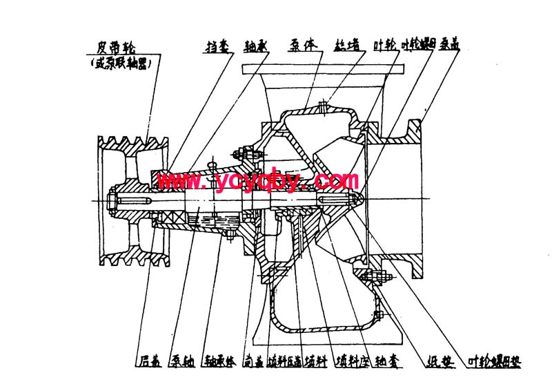 "盐泵"牌混流泵为卧式、单级、单吸、前后开门结构、悬臂式混流泵。适用于输送清水或物理、化学性质类似与水的其他液体,被输送液体的温度不能高于50度。主要由泵盖、叶轮、泵体、泵轴、轴套、填充材料及轴承体(轴承架)等主要零件构成,采用前、后开门的结构形式。如图