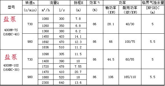 400HW混流泵的性能参数 |